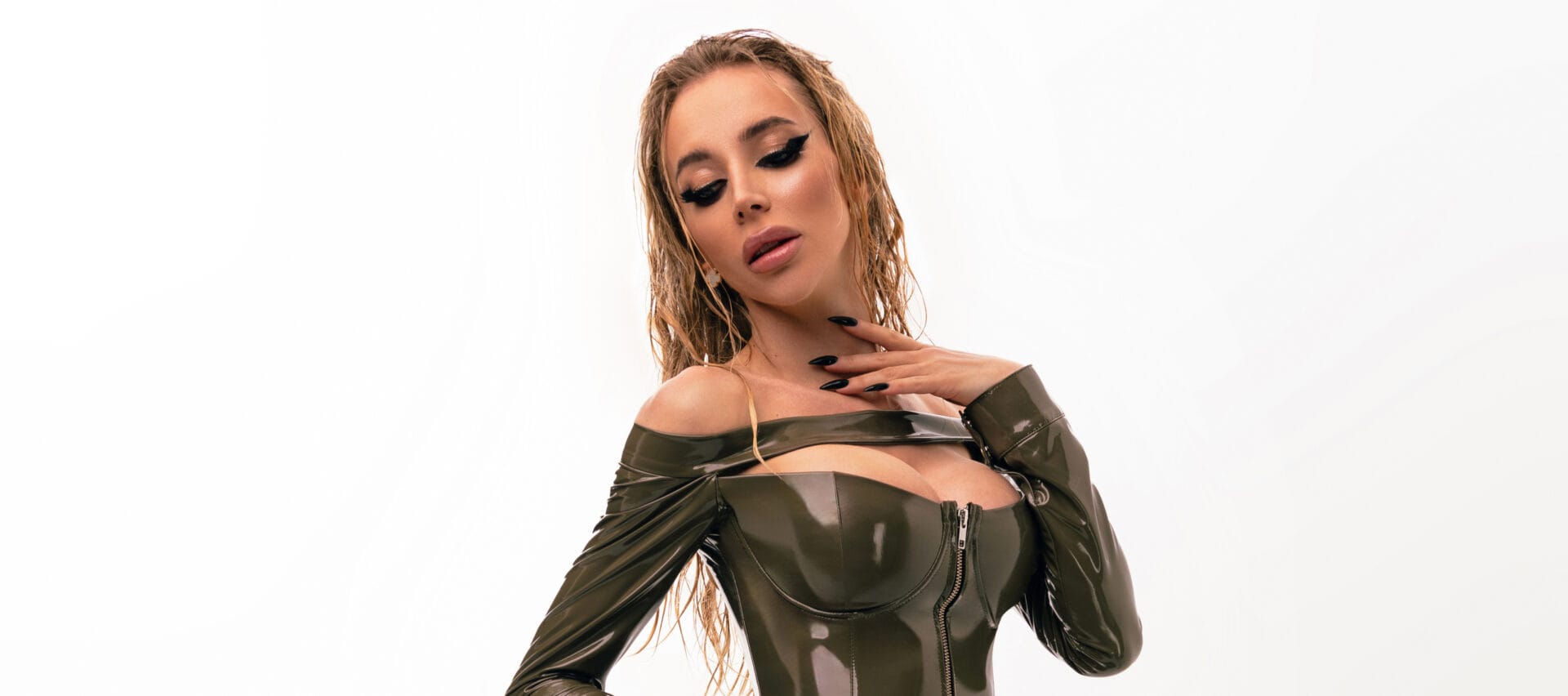 Accompanying the two-track EP release are two music videos, each serving as an at-home studio performance. In the videos, Karry G stands behind a DJ deck with a recording microphone to her left and two large speakers on either side. She’s illuminated by a bright sky-blue background, wearing a strapless black top tied at the back with a silver glittery block design across her chest, paired with a black leather-like skirt and black headphones. Her hair is styled in a bun with a black ribbon, while two blonde face-framing strands fall down to her chest. Karry G feels every beat and note, grooving effortlessly to her own music.